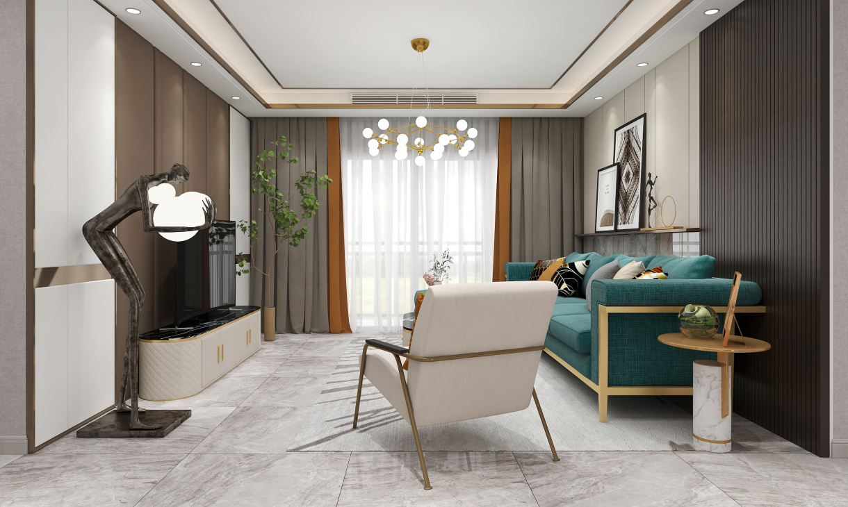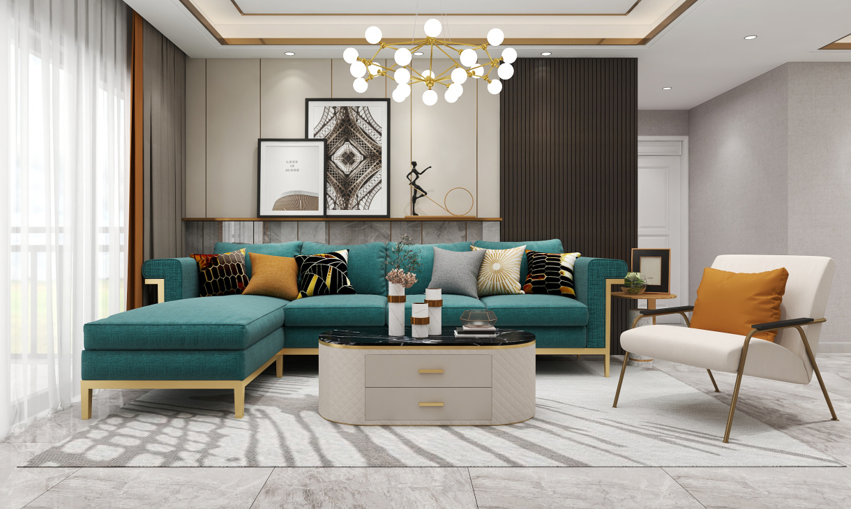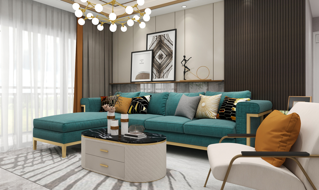 黃銅的骨架搭配時尚感十足的孔雀藍的布藝沙發,完美營造出時尚與品位,精致的茶幾和吊燈更顯格調。