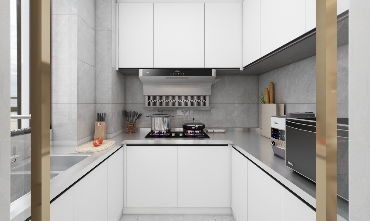 廚房空間太小設計成 U型廚房,最大程度利用空間,剩下櫥柜顏色一致,整潔大氣,隱形拉手的設計使用方便又美觀。