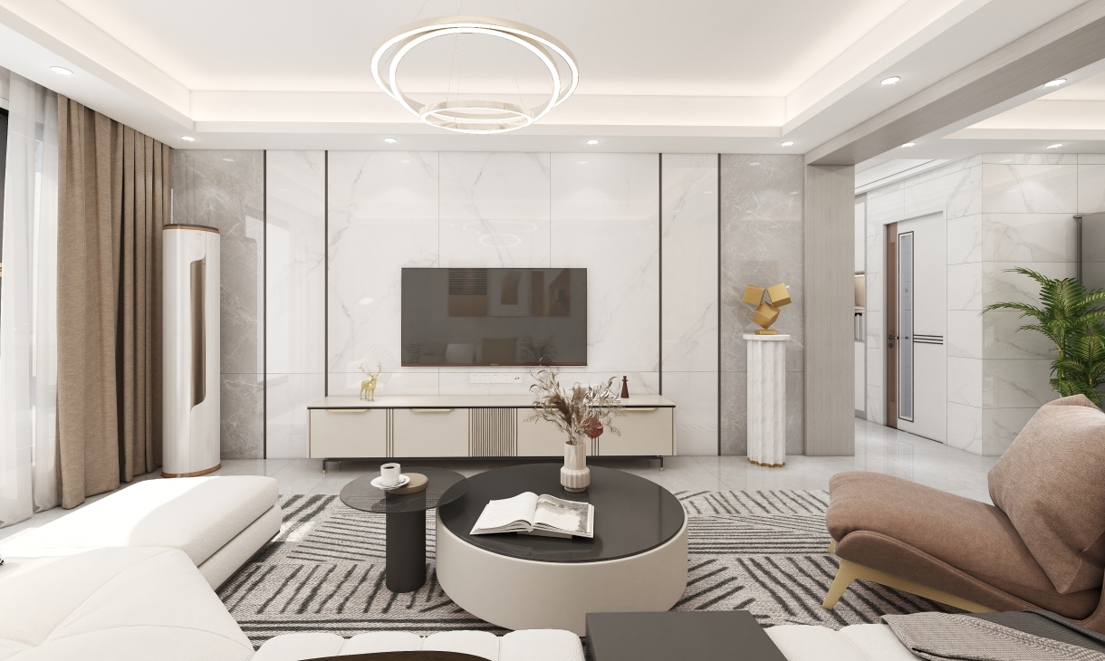 客廳空間常用來招待客人,設計時更應該注重品位,整體空間以米白色為主,簡潔的電視矮柜搭配精致的茶幾與沙發,時尚大氣。