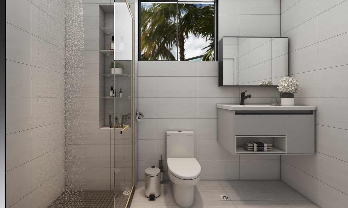衛生間的設計干濕分離明確,灰色的衛浴柜搭配鏡柜實用又大氣,懸空設計底部易清理,浴室內部做壁龕簡潔又實用。