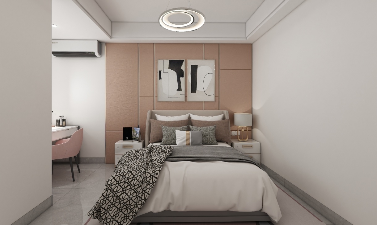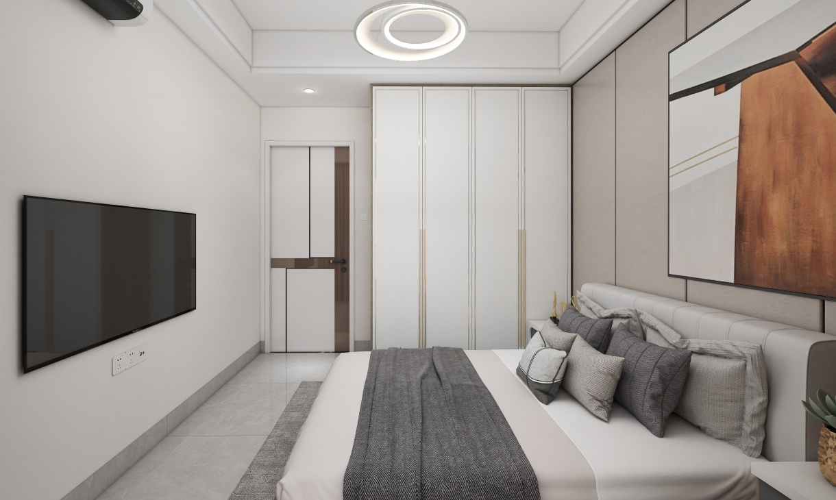 次臥空間的衣柜與臥室一致,白色與灰色組合的床頭柜現代感十足,床頭柜上擺放綠植與背景墻上的裝飾畫豐富空間,營造出精致又舒適的次臥空間。