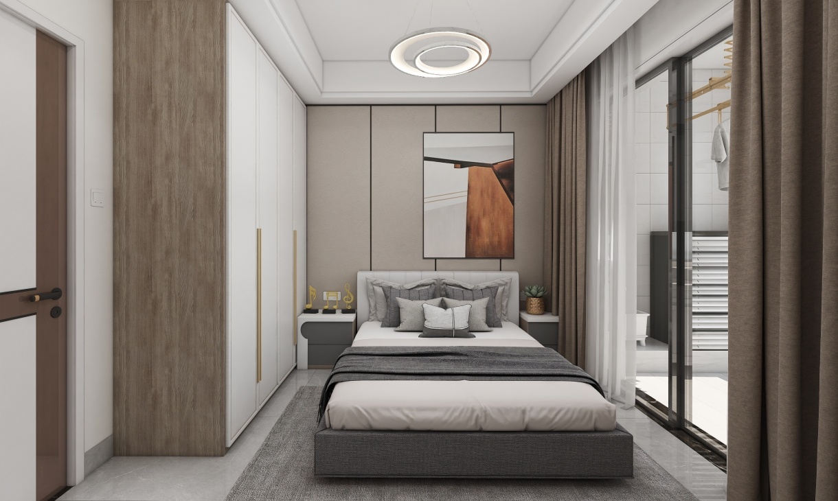 棕色的軟包床頭背景墻與窗簾顏色相呼應,淺灰色的床飾更顯舒適與品位,衣柜設計一柜到底非常大氣。