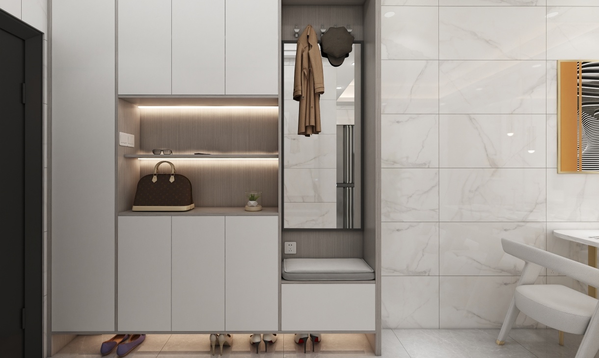 玄關的設計很重要,第一眼讓人感受到家的實用與精致,到頂的玄關柜分區布局明確,換鞋凳、梳妝鏡應有盡有。