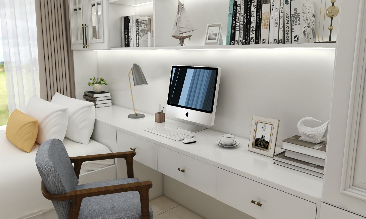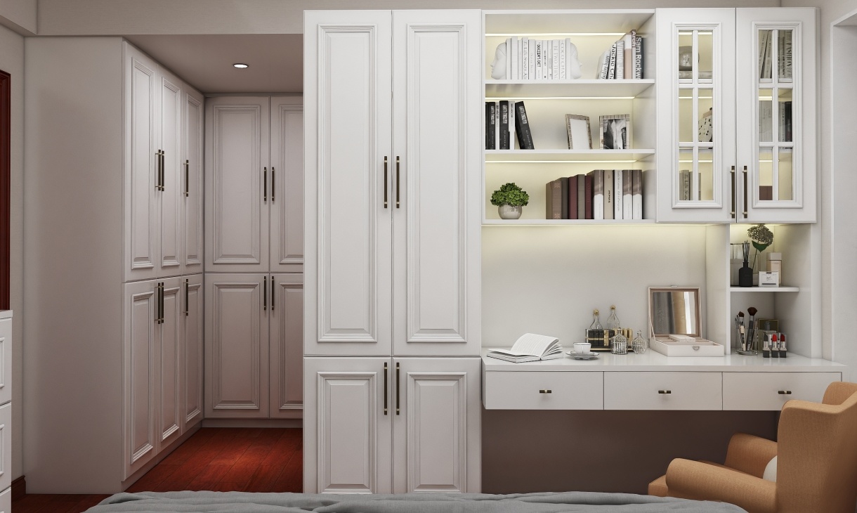 主臥衣帽間與實用區巧妙結合,白色的到頂收納柜與書桌組合一體化柜體與墻面顏色深淺搭配,精致小巧的拉手實用加倍。