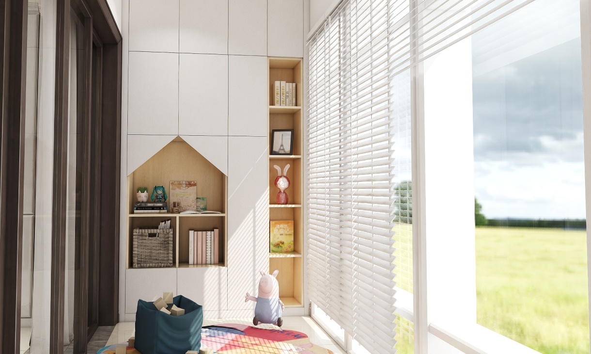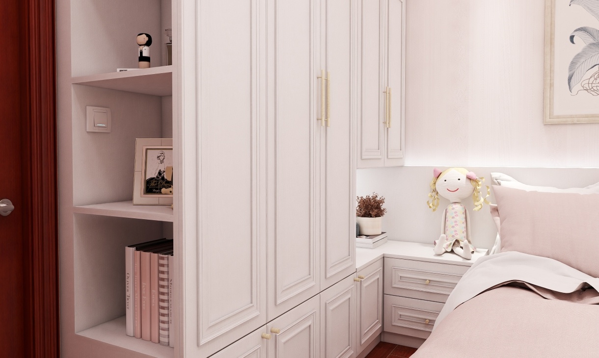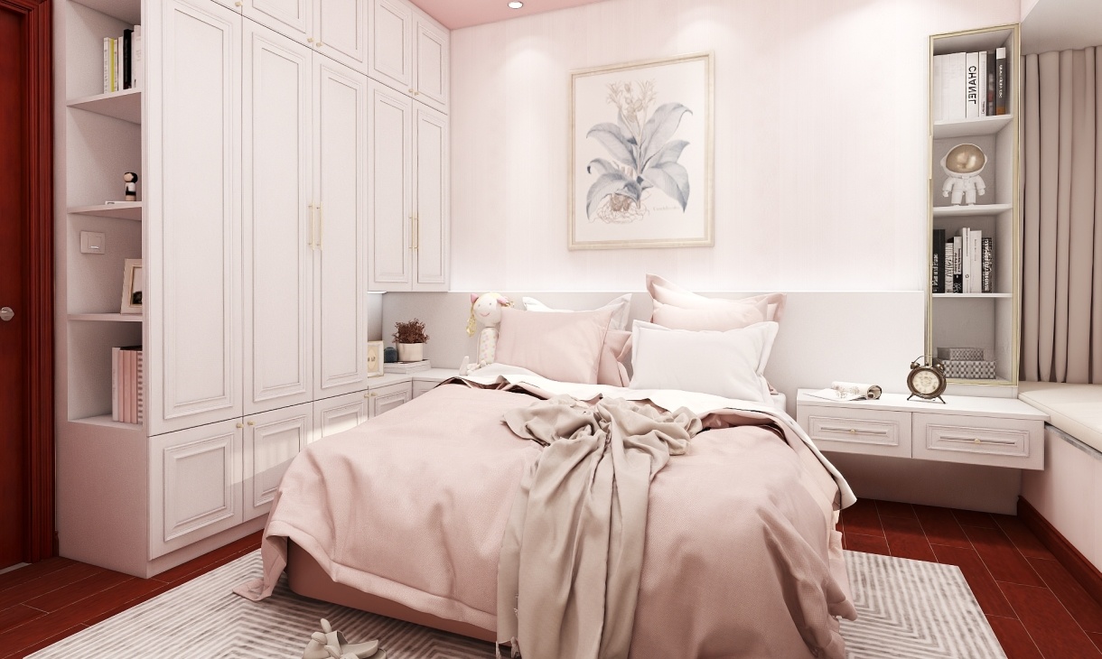 兒童房空間以粉色為主,整體設計更貼合居住者的喜好,造型飄窗和書桌搭配復古小鬧鐘豐富空間,木質地板增添溫馨感。