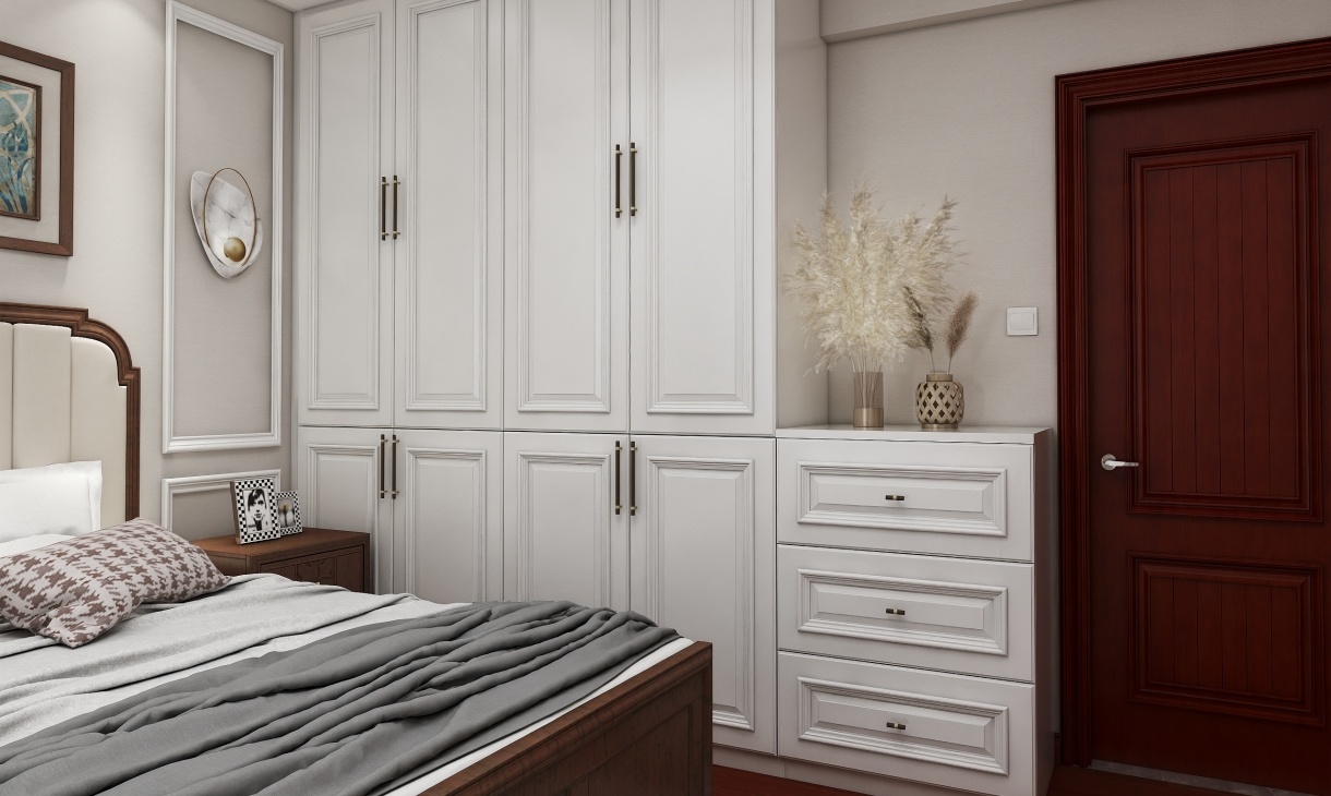 衣柜的柜體和轉角處臺面以白色為主,預留開關位置,收納柜上擺放裝飾空間小物件與床飾相呼應,整體設計格外時尚。