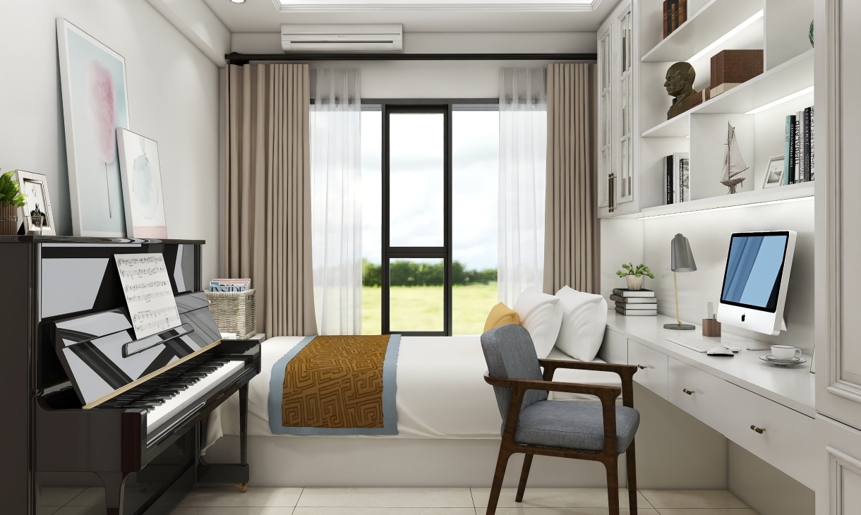 書房設計以實用為主,到頂收納柜的設計給人的感覺是簡單、大方,榻榻米床體設計增添舒適感,空間顏色搭配素雅而不單調,營造出舒適寧靜之感。