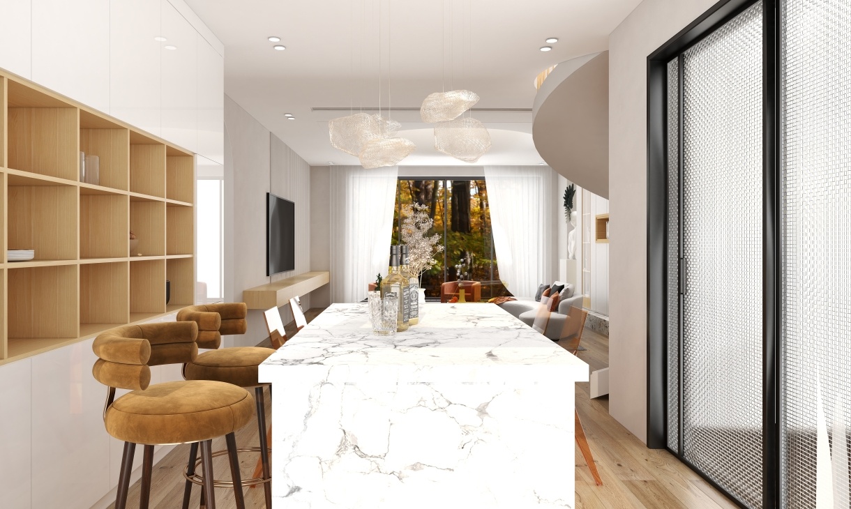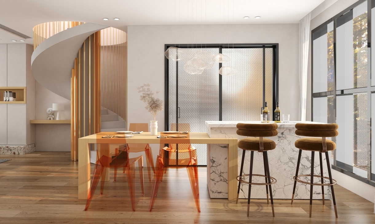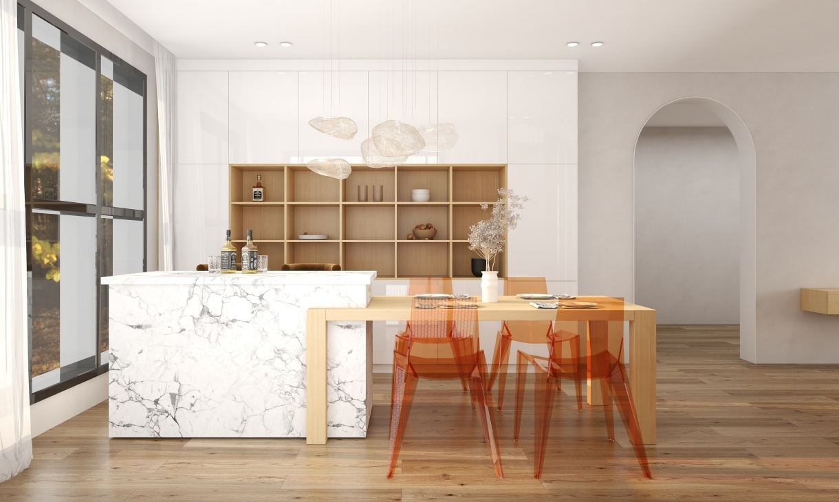 大理石吧臺延伸至木質餐桌,巧妙設計節省空間又有格調,這種設計增強了空間的層次感,到頂的餐邊柜設計實用又大氣。