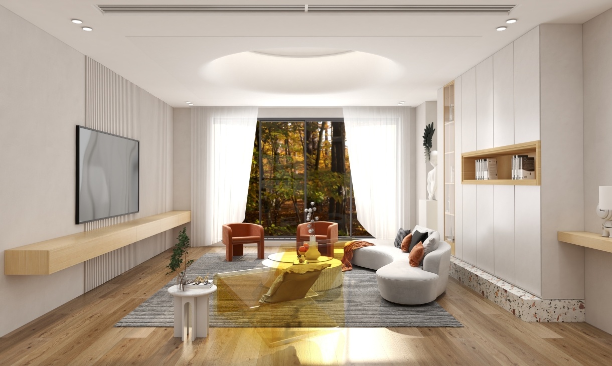 客廳的設計簡潔大氣,線條感十足的電視柜搭配造型獨特的沙發,層次分明且美觀,木質板材作為點綴豐富整個家居空間,時尚有品位。