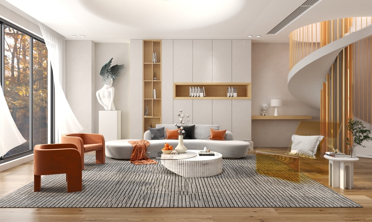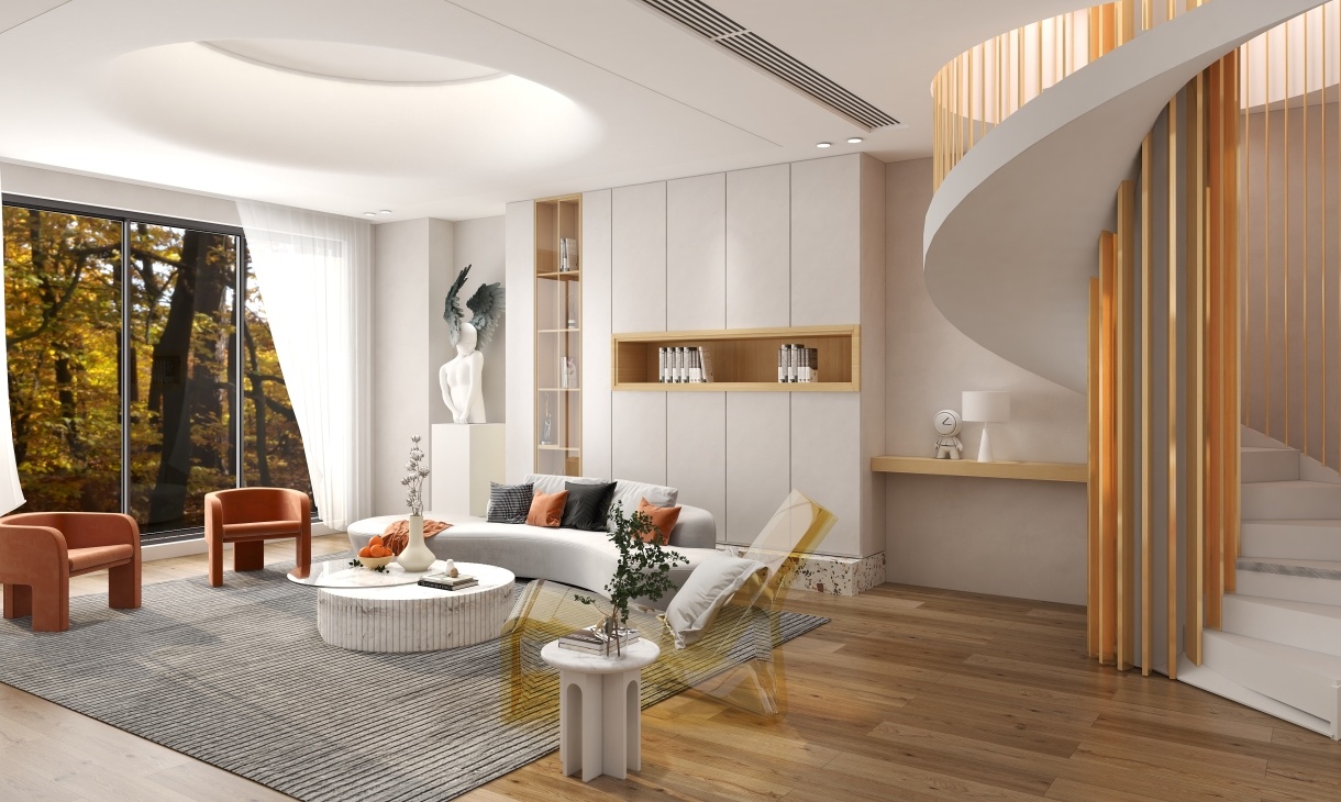 白色的墻面和灰色沙發盡顯品位,簡雅清新的木質造型背景墻的設計,搭配螺旋吊燈的設計給人以時尚藝術的美感。