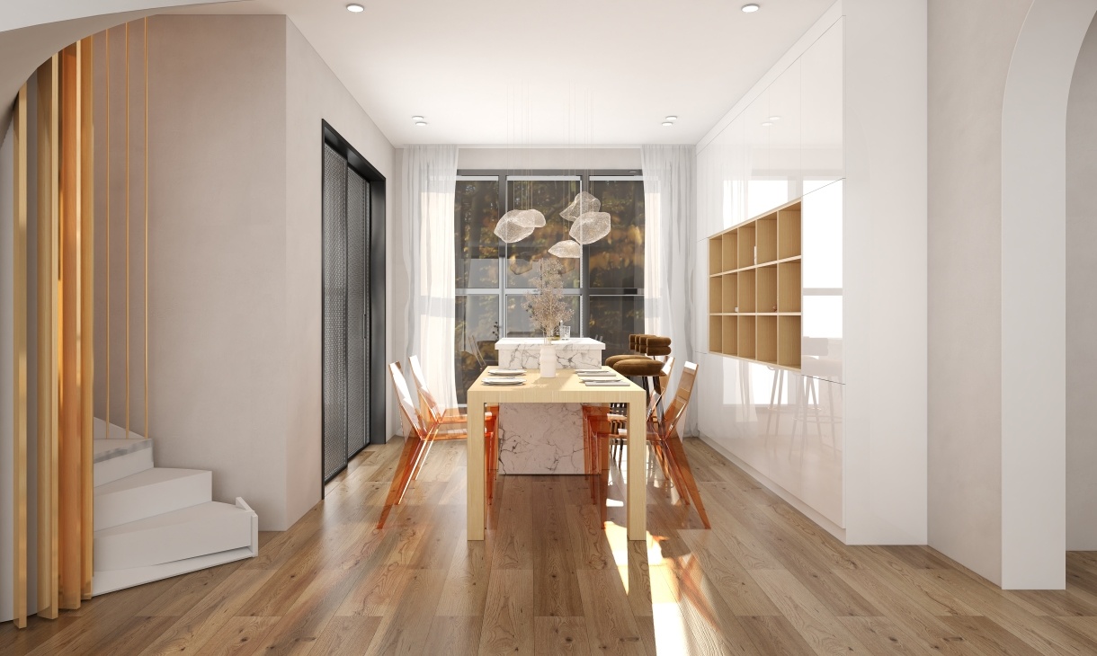 餐廳與客廳一體化設計,餐廳的落地大窗與客廳相呼應,形成一個明亮舒適而又寬敞大方的用餐氛圍,盡顯生活品位。