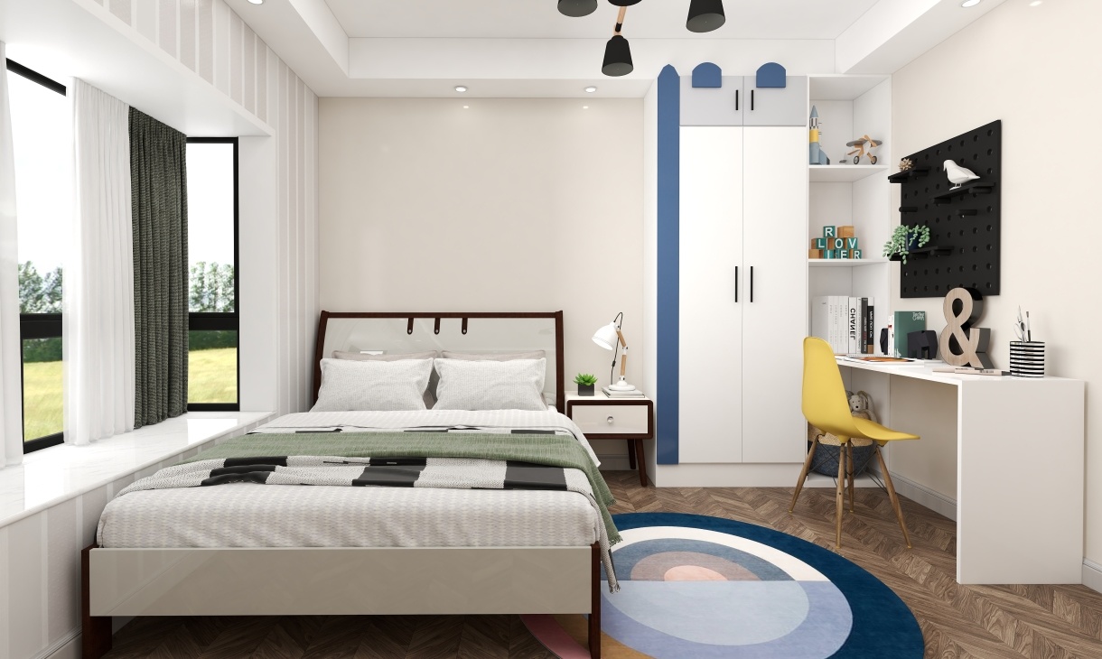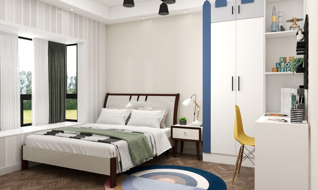 為了滿足孩子成長中的學習需求,設計衣柜與書桌組合,既滿足了衣物的收納需求又能擁有獨立的學習空間。