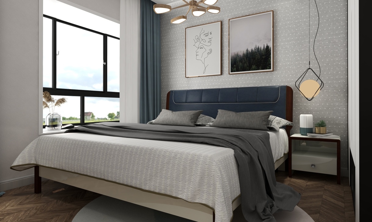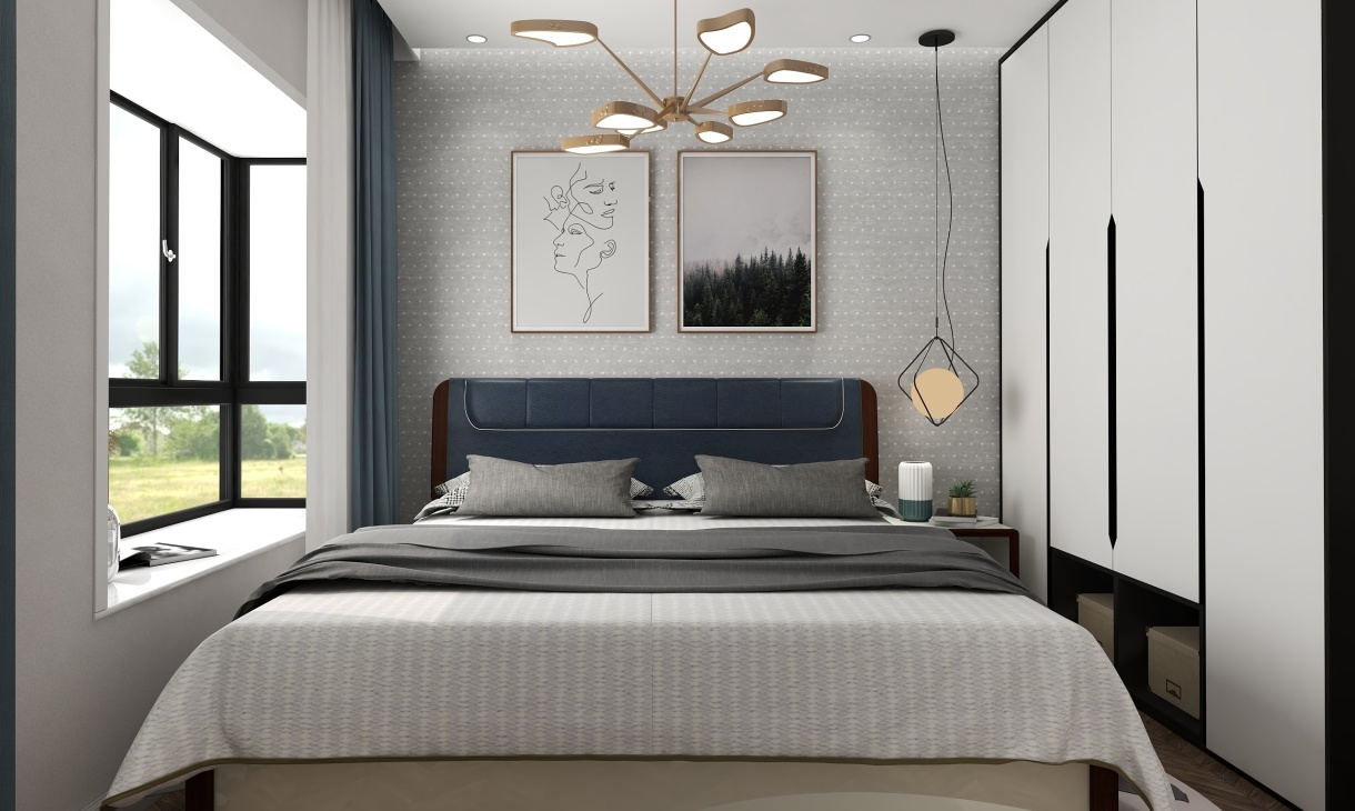 飄窗空間不浪費,擺放裝飾物提升空間格調,灰色的軟裝搭配質感滿滿,床頭設計懸掛暖光燈搭配木地板,營造出溫馨又安靜的臥室空間。