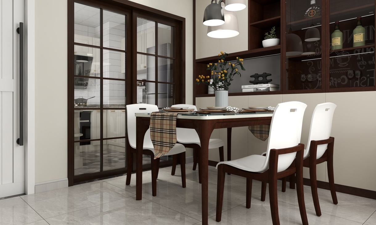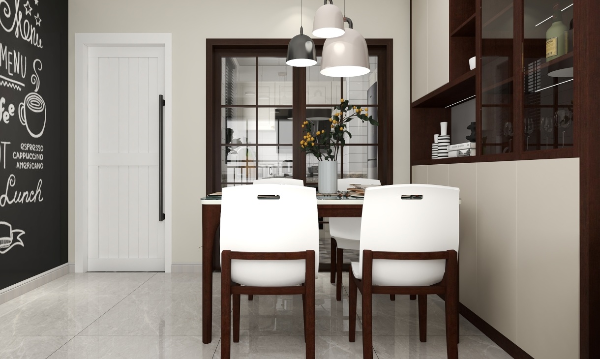到頂餐邊柜為了更顯整潔,采用隱形拉手,搭配懸掛吊燈品位十足,整體設計營造出溫馨舒適的用餐空間。