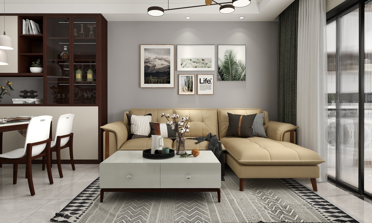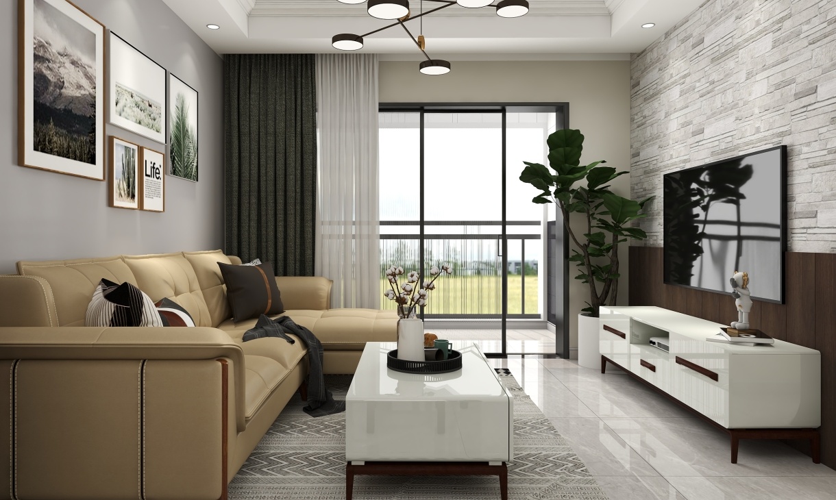 客廳最顯眼的落地大窗保證客廳的光線充足,白色的電視柜和茶幾整潔大氣,鵝黃色的皮質沙發清新明亮,綠植點綴使得客廳溫馨美觀。