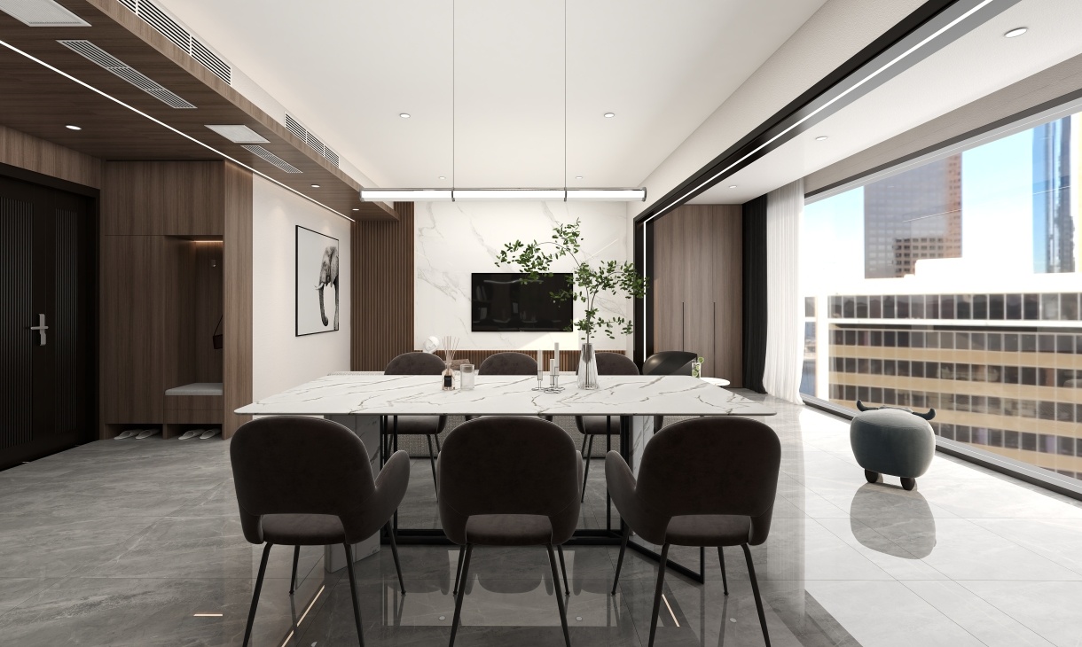 客餐廳一體化設計既實用又大氣上檔次,大理石餐桌與電視背景墻相呼應,整個空間通透明亮。