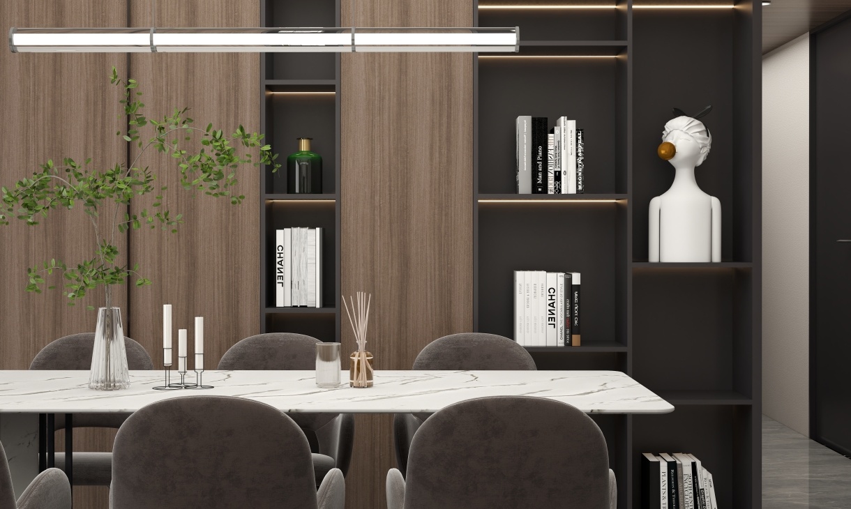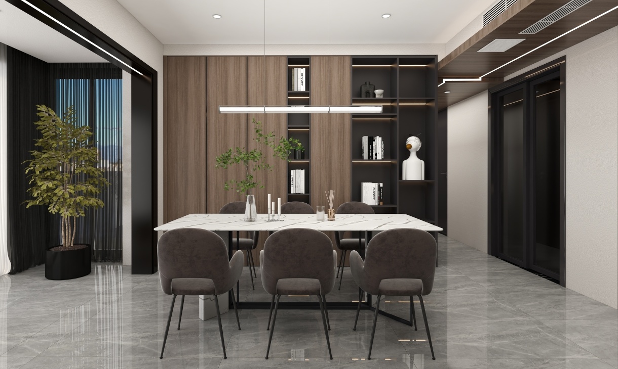 餐廳設計最巧妙的地方就在于以餐邊柜為背景,整體設計沒有復雜的裝飾,綠植點綴簡單耐看又不失品位。