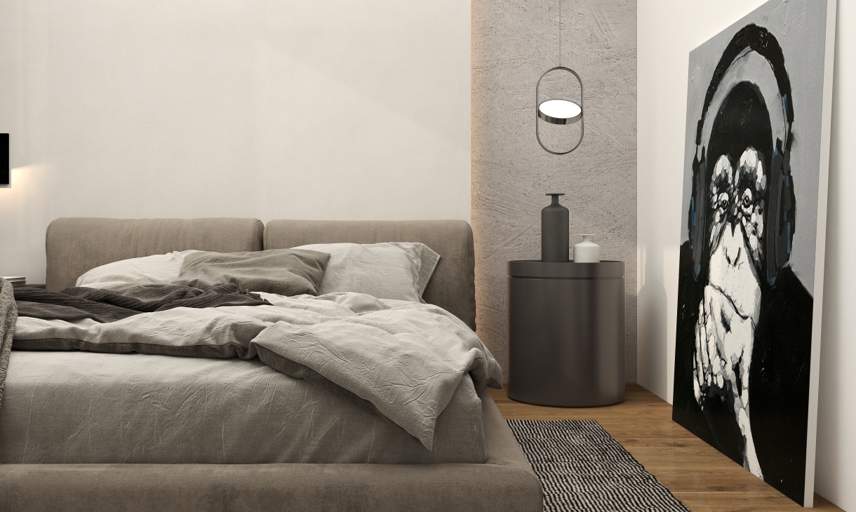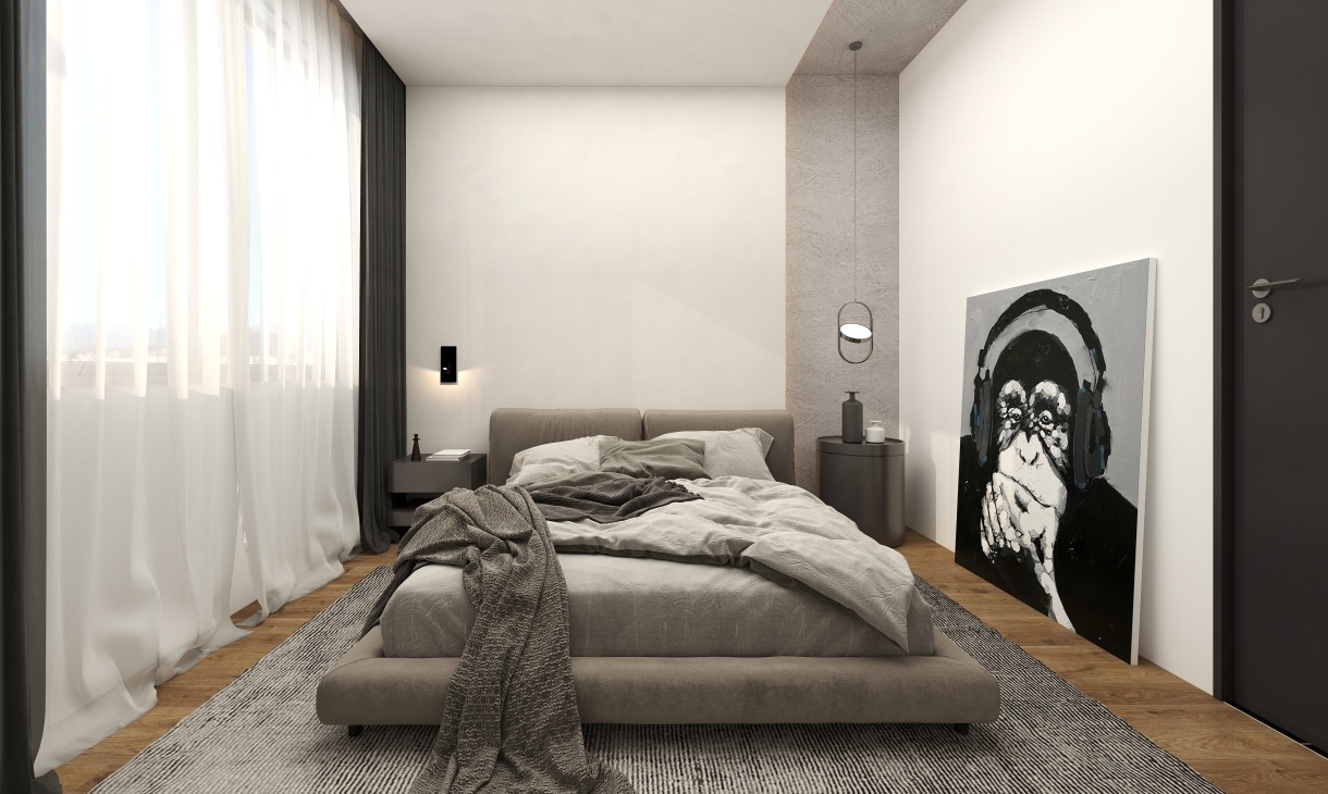 高級灰的軟飾搭配米黃色的墻面沉穩大氣,再用裝飾畫和暖光燈營造出溫馨之感,陽光從紗窗照進臥室盡顯舒適。