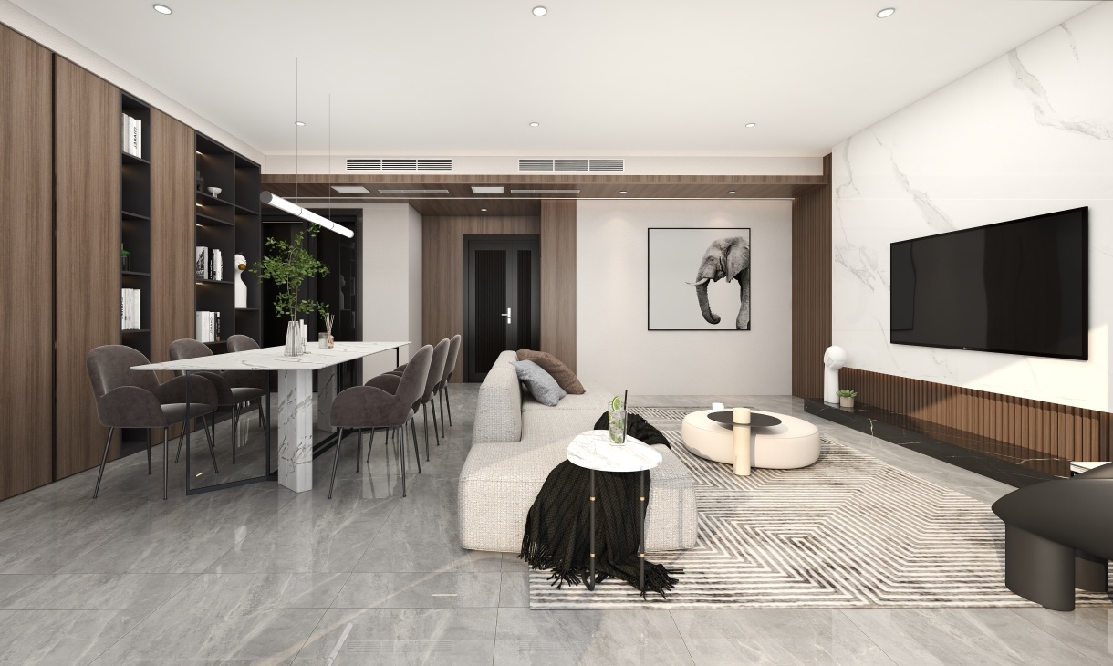 客餐廳設計于一體,地板鋪貼當下最流行的灰色亮面瓷磚,大理石和木質板材的電視背景墻現代感十足,到頂的餐邊收納柜采用木質板材時尚大氣。