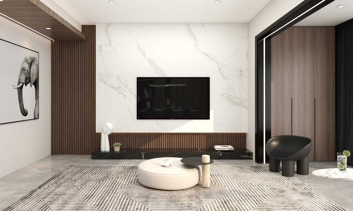 客廳的配色簡單,白色和灰的色調為主結合木質板材,讓客廳顯得既沉穩而又不失時尚,白色大理石+木質板材的電視背景墻,營造出品位與舒適兼顧的客廳空間。
