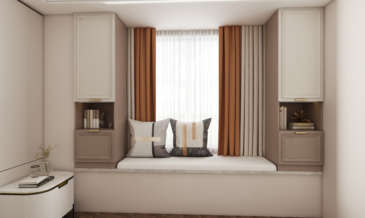 飄窗兩側設計成收納區,既滿足了使用需求又提升格調,米色與棕色相互搭配的窗簾與空間相互融合,整體設計風格統一有格調。