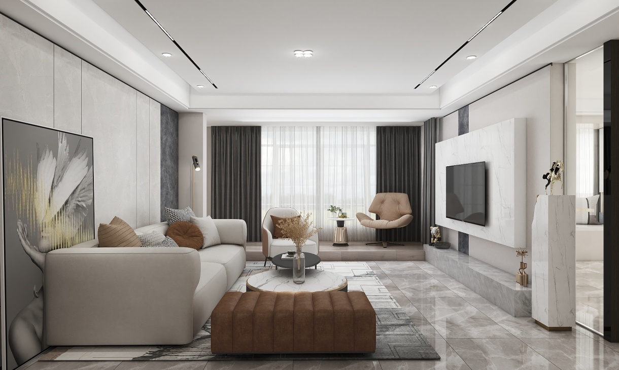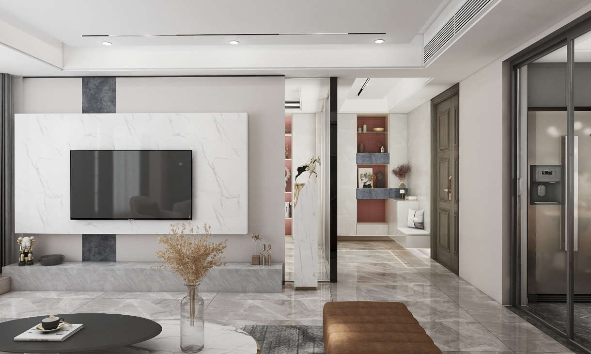 客廳與其他空間利用走廊隔開,使得整個空間通透明亮,大理石電視背景墻搭配淺灰色的電視柜格調十足。