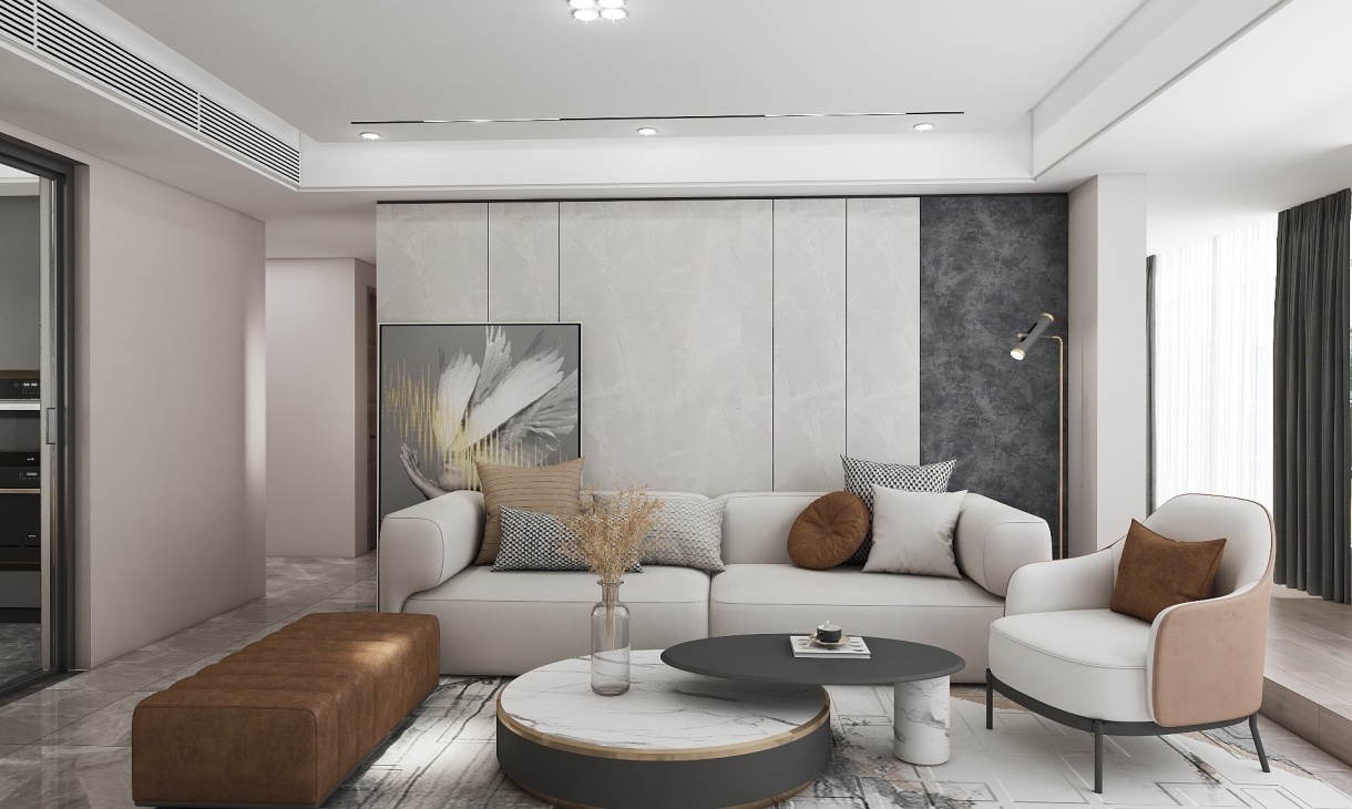 喜歡簡約大氣的客廳,現代風必不可少,采用當下最流行的灰色地磚搭配大理石電視背景墻,整潔又有品位,米白色一字型沙發布局盡顯舒適。