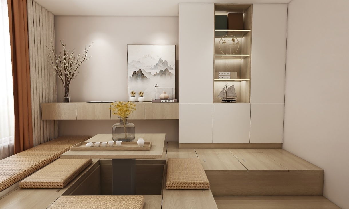 升降式榻榻米非常實用,既能當做休閑區招待親朋好友,都可以當做收納區,儲藏過季衣物,整體色調盡顯溫馨,窗簾的設計與其他空間相呼應。