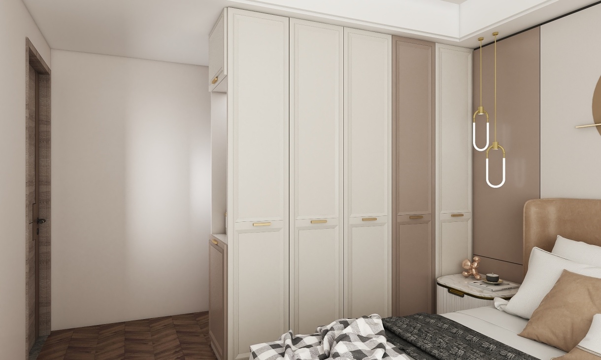 到頂衣柜選擇跳色設計時尚又美觀,精致的金屬條形拉手增添質感,床頭懸掛設計感十足的吊燈,營造出溫馨又大氣的臥室空間。