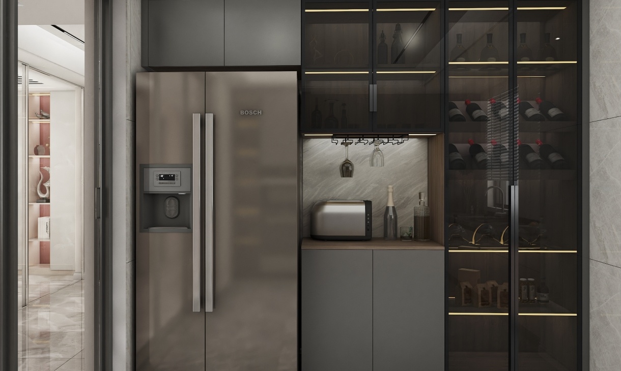 鑲嵌式的冰箱,巧妙利用每一寸空間,這樣設計拿取方便又美觀,玻璃柜門增強通透性,柜內安裝燈管使用更方便又上檔次。