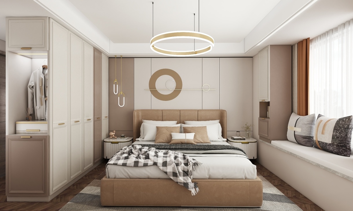 臥室的設計主要采用米色和淺咖色,兩種色調完美搭配營造出詩是具有高級的空間氛圍,飄窗設計成休閑區,兩側設計到頂收納柜,增強空間的儲納能力。