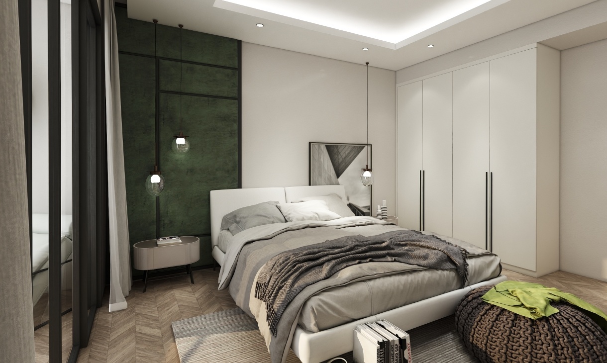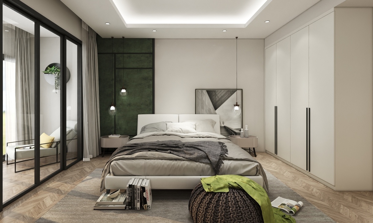 臥室空間采用木地板盡顯舒適溫馨,床頭背景墻以深綠色為點綴,色調搭配與客廳相呼應,臥室與陽臺空間用玻璃門隔開更有品位。