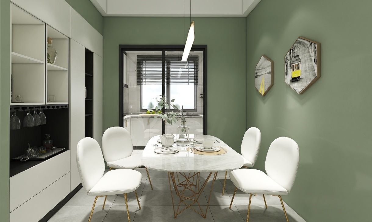 餐廳空間不大,豆綠色的墻面+大理石金框餐桌、餐椅突出了家的獨特品位,吊燈的設計搭配到頂餐邊柜的營造了豐富又實用的餐廳空間。