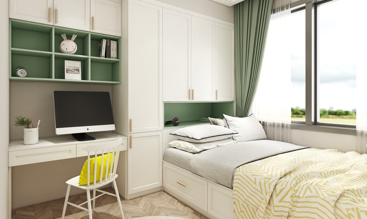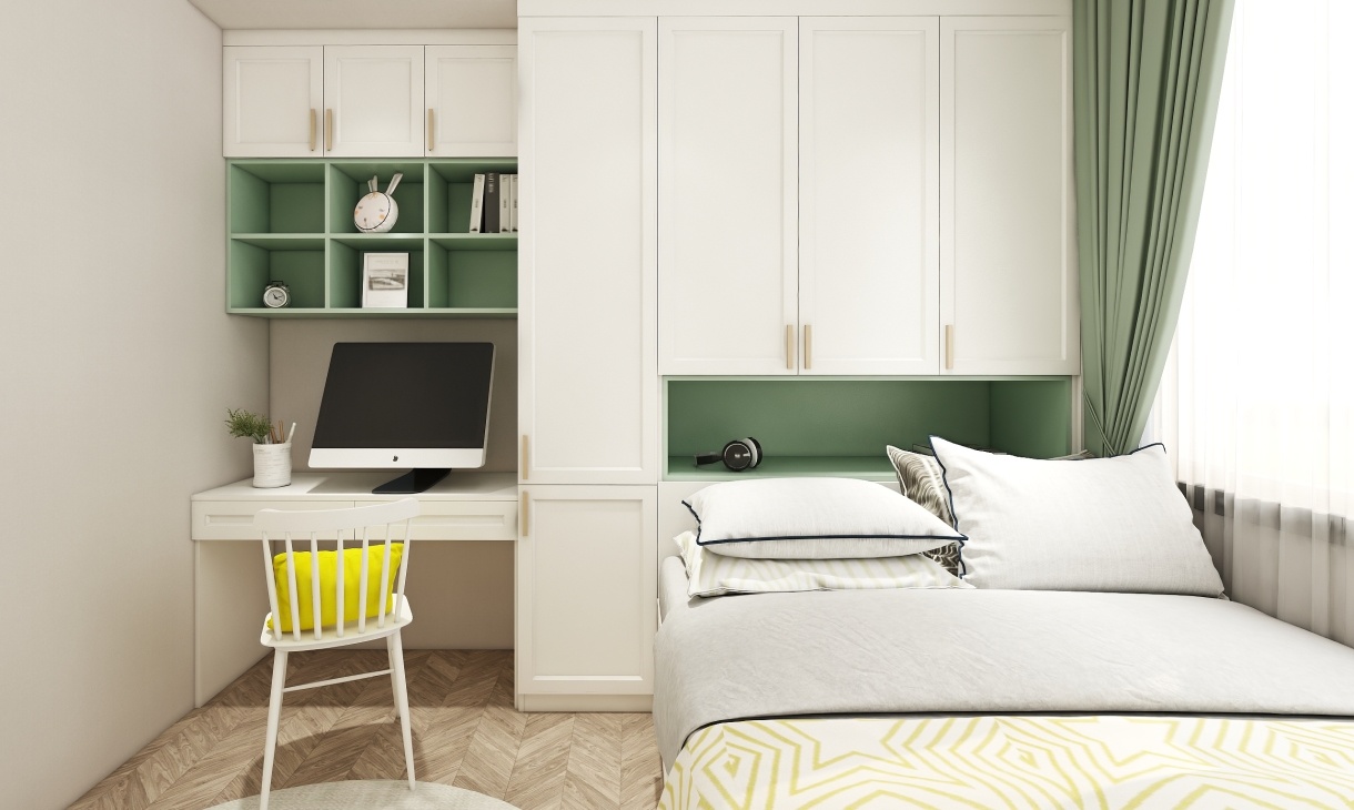 兒童房設計實用簡潔,白色+綠色營造出清新實用的空間,榻榻米床體的設計滿足收納需求的同時又節省空間,書桌一體化更加實用。