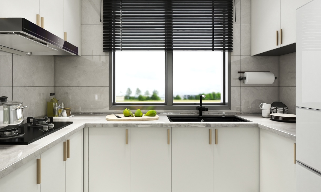 廚房的設計一實用整潔為主,上下柜體顏色一致格外大氣,小空間設計成U字形廚房,石英石臺面實用易清理。