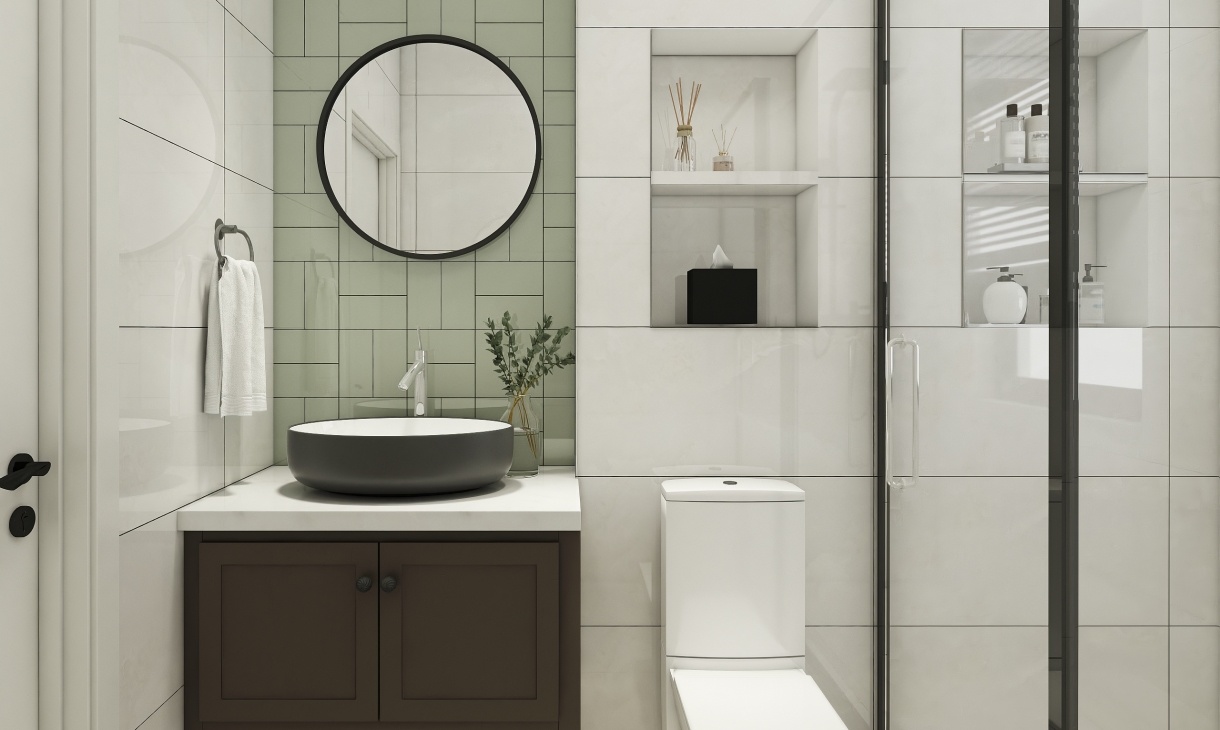 衛生間設計干濕分離明確,豆綠色的瓷磚與其他空間相呼應,馬桶上方做壁龕收納更方便。