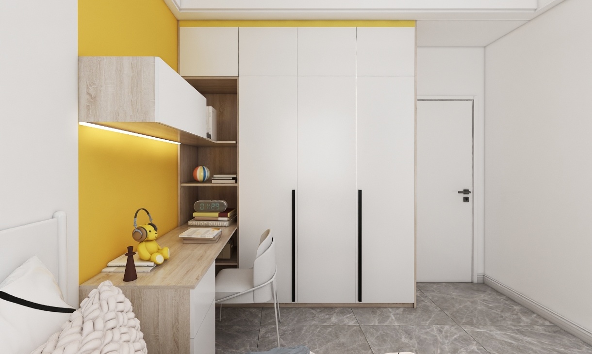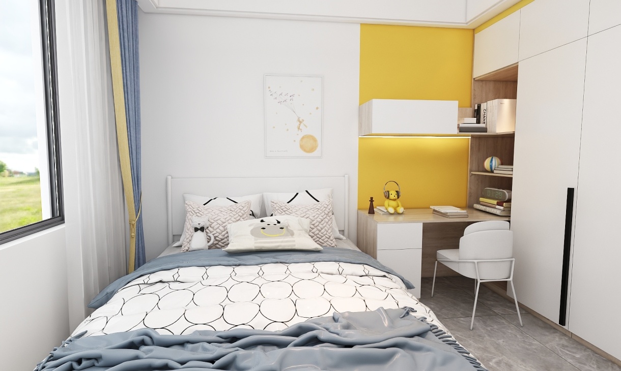 次臥的設(shè)計用白色+檸檬黃組合為主,轉(zhuǎn)角處設(shè)計書桌組合搭配到頂衣柜的設(shè)計既節(jié)省空間又很美觀。
