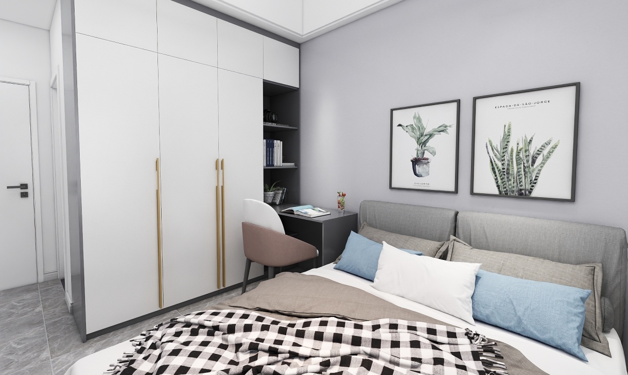 臥室的設(shè)計以舒適為主,為了保證良好的睡眠質(zhì)量,顏色和布局都是精心搭配的,書桌和衣柜組合更實用。