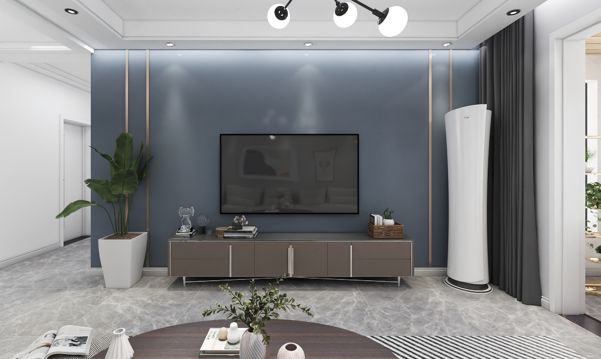 客廳背景墻用藍(lán)色乳膠漆作為裝飾,提升空間的格調(diào),加上咖色的電視柜,兩者的搭配讓客廳格外有品位。