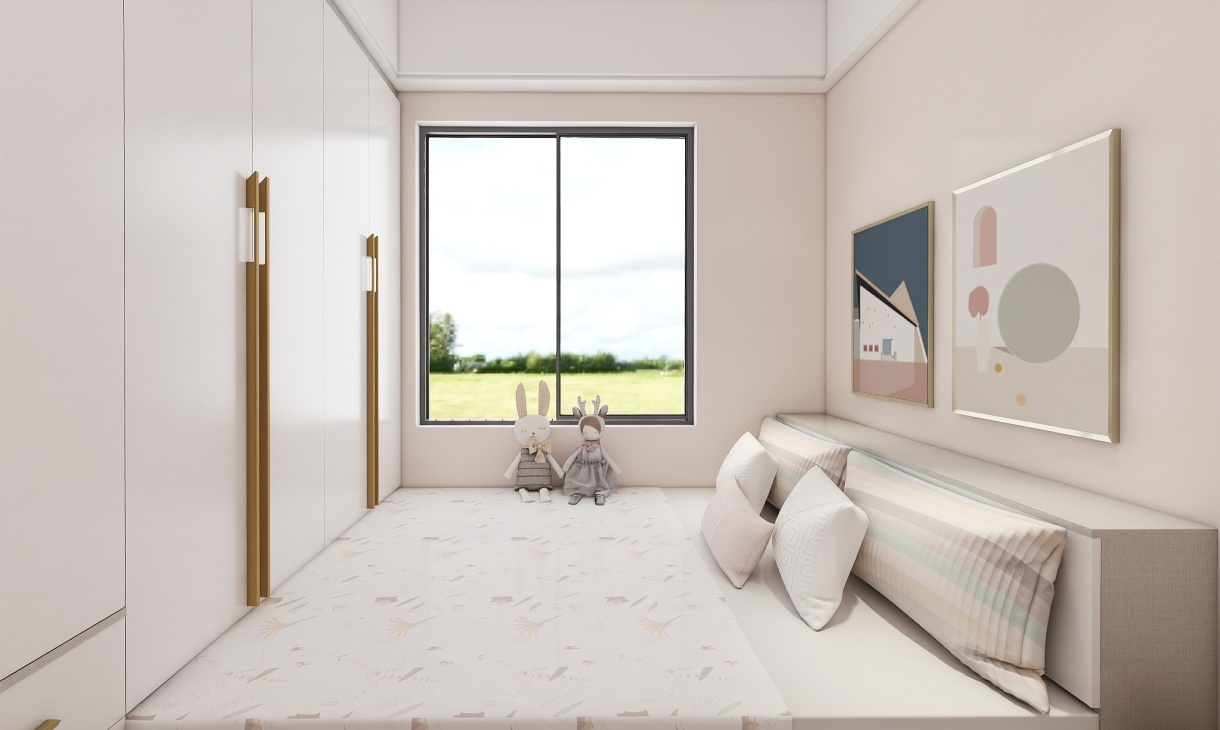 榻榻米的設(shè)計既滿足大容量收納又十分美觀,衣柜的設(shè)計簡潔大氣,軟飾搭配更好的提升空間品位。