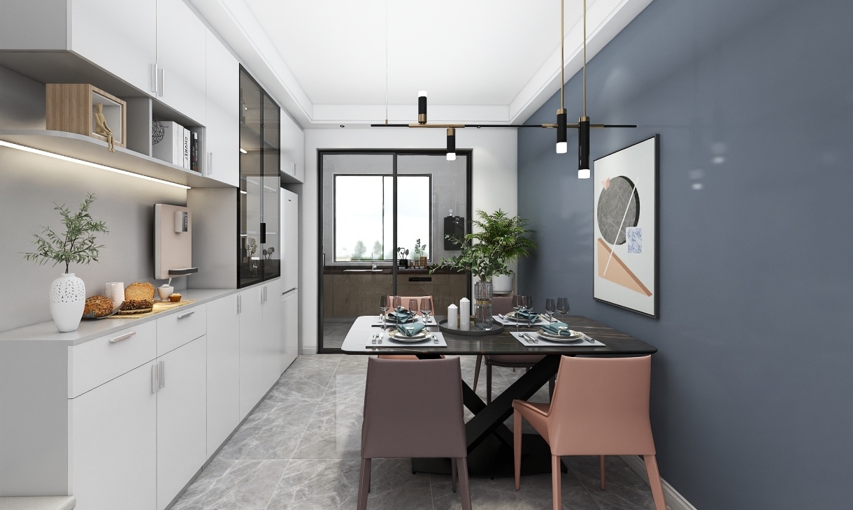 餐廳的空間不大,餐桌靠墻設(shè)計節(jié)省空間,藍(lán)色的背景墻搭配黑色大理石餐桌營造出舒適溫馨有品位的空間氛圍。