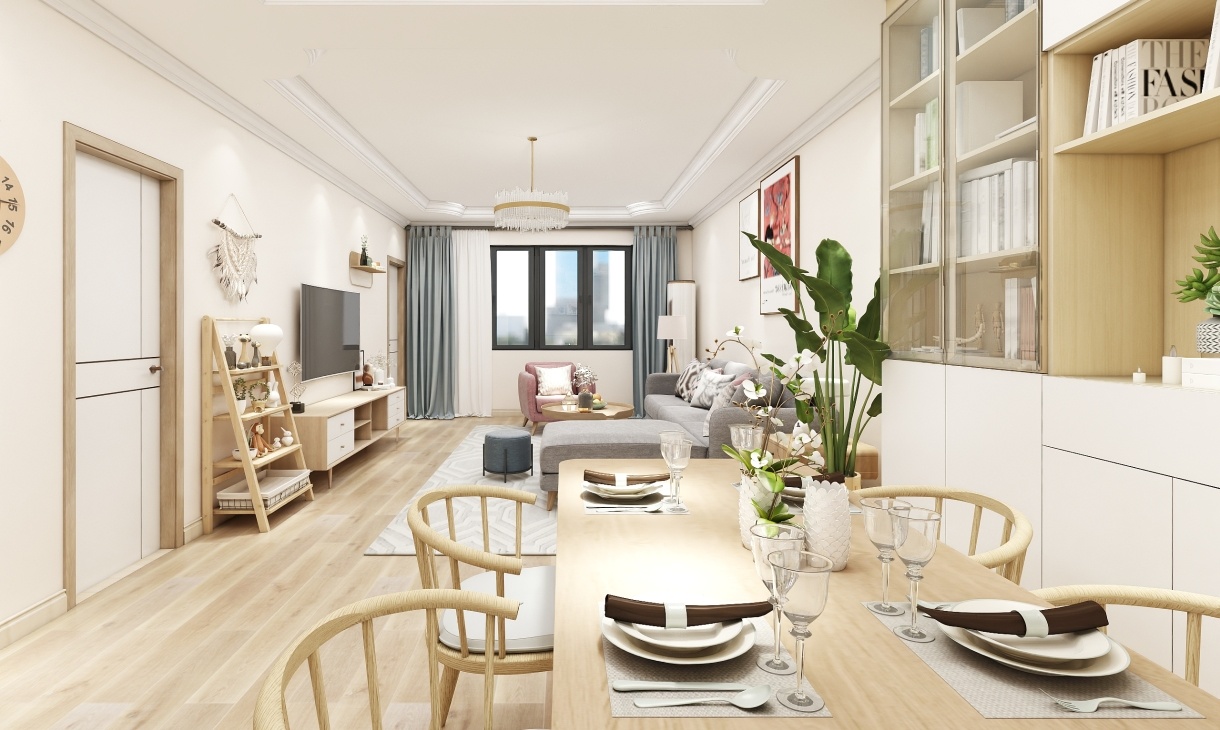 餐桌與餐邊柜平行設計更節省空間,L型的沙發布局在視覺上形成層次感,木質家具和地板營造出舒適溫馨之感。