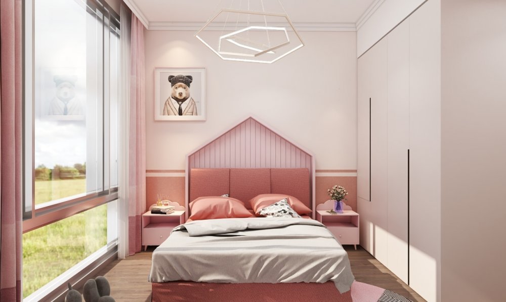 孩子的世界都是天真干凈的,設(shè)計(jì)用粉色打造出舒適的氛圍,床頭的設(shè)計(jì)與裝飾物充滿童趣,給孩子一個(gè)幸福發(fā)童年。