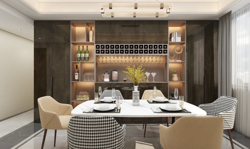 食物沒有高低貴賤之分,但享受會(huì)因?yàn)榭臻g環(huán)境而改變,餐邊柜設(shè)有酒柜區(qū)、擺放區(qū),兩側(cè)設(shè)計(jì)成開放區(qū)集收納、展示于一體。