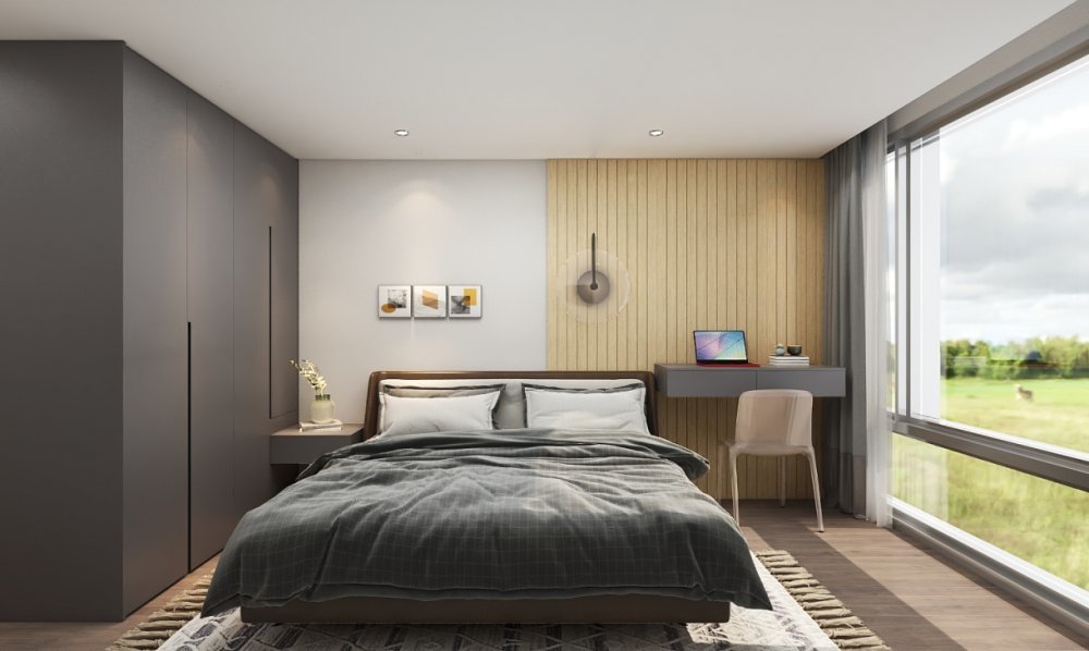 臥室的設(shè)計(jì)不僅要滿足基本的舒適需求,灰色的到頂實(shí)用,色調(diào)沉穩(wěn)大氣與床飾相呼應(yīng),木質(zhì)拼接背景墻增添時(shí)尚感。