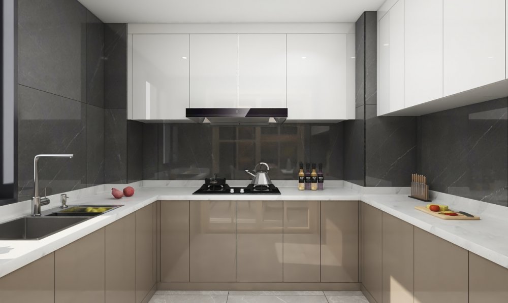 整體櫥柜設(shè)計(jì)上淺下深,形成簡(jiǎn)潔的視覺效果,按壓柜門的設(shè)計(jì)使用方便整潔加倍,在炒菜手忙碌時(shí),手腕按壓就能打開柜門使用更便捷。