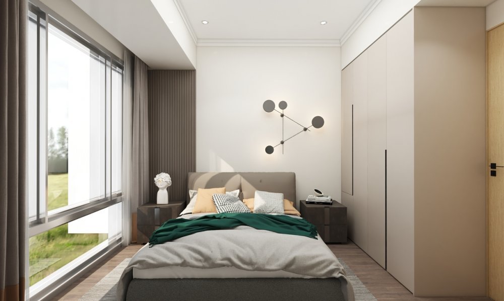 次臥的設(shè)計(jì)主要以舒適為主,到頂衣柜選擇淺咖色搭配黑色條形拉手,整潔之中不失品位,床飾與背景墻相呼應(yīng)形成統(tǒng)一的家居空間。