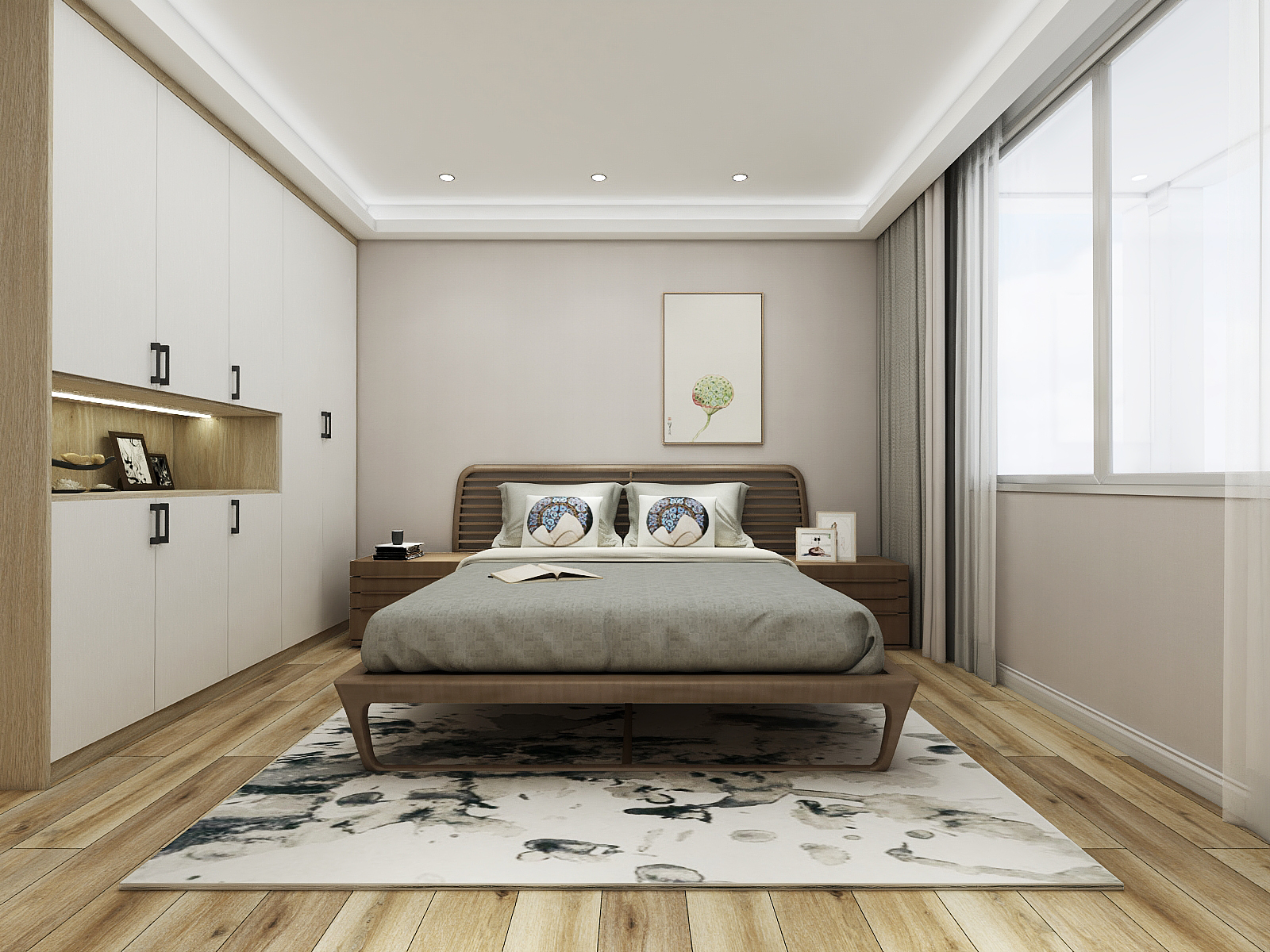 木地板讓主臥顯得有格調,帶著現代極簡淡淡的優雅,頂柜式設計最大化的利用空間,在充足的存儲空間之余,設計了展示區域,不僅可以用來展示,存取也方便,飄窗上放置柔軟的坐墊和小桌子,營造了舒適愜意的睡眠環境。