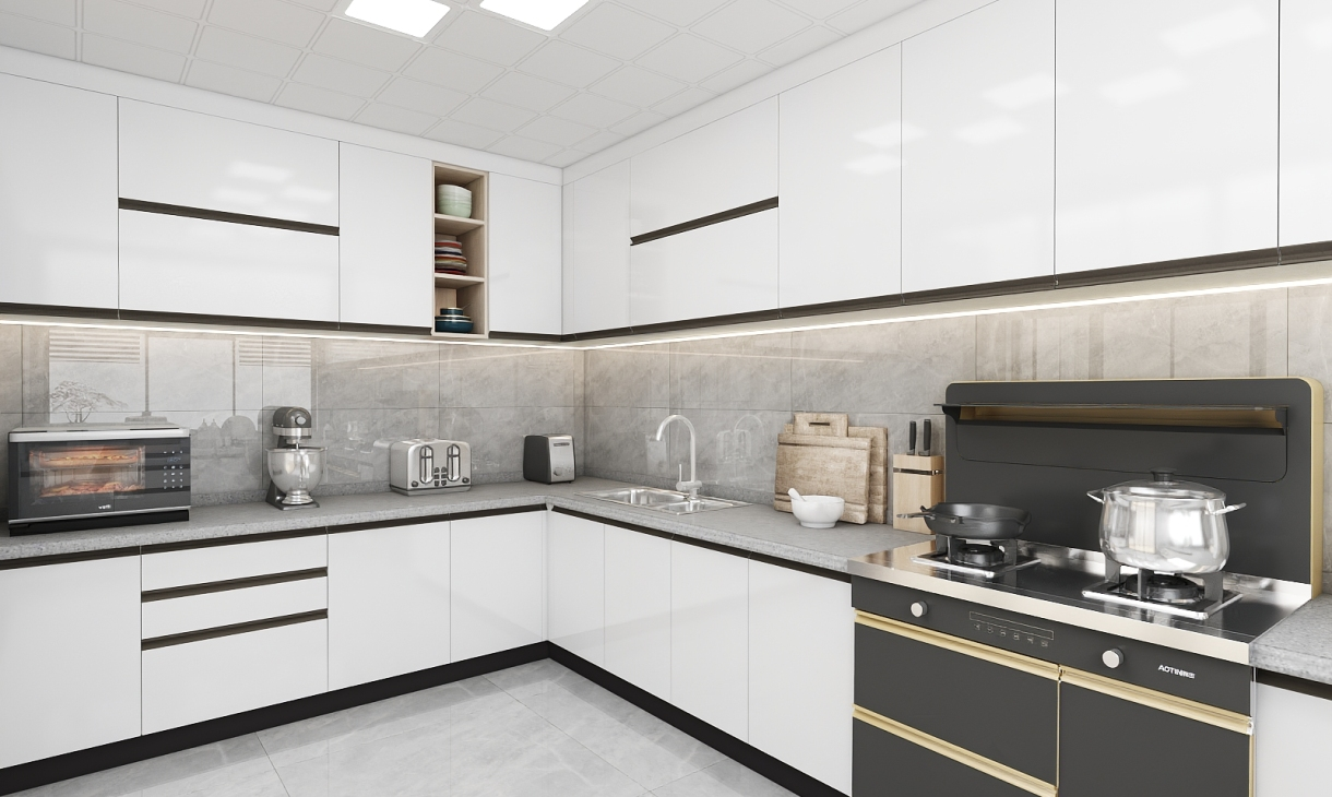 廚房是呈“L”型的流水臺設計,充足的柜體讓空間能夠保持整潔,純白的柜體搭配淺灰色的墻面,白與灰的色彩對比,加上柔和的燈帶,起到照明作用的同時,也提升整體氛圍,映襯出柔軟與硬朗視覺感受。