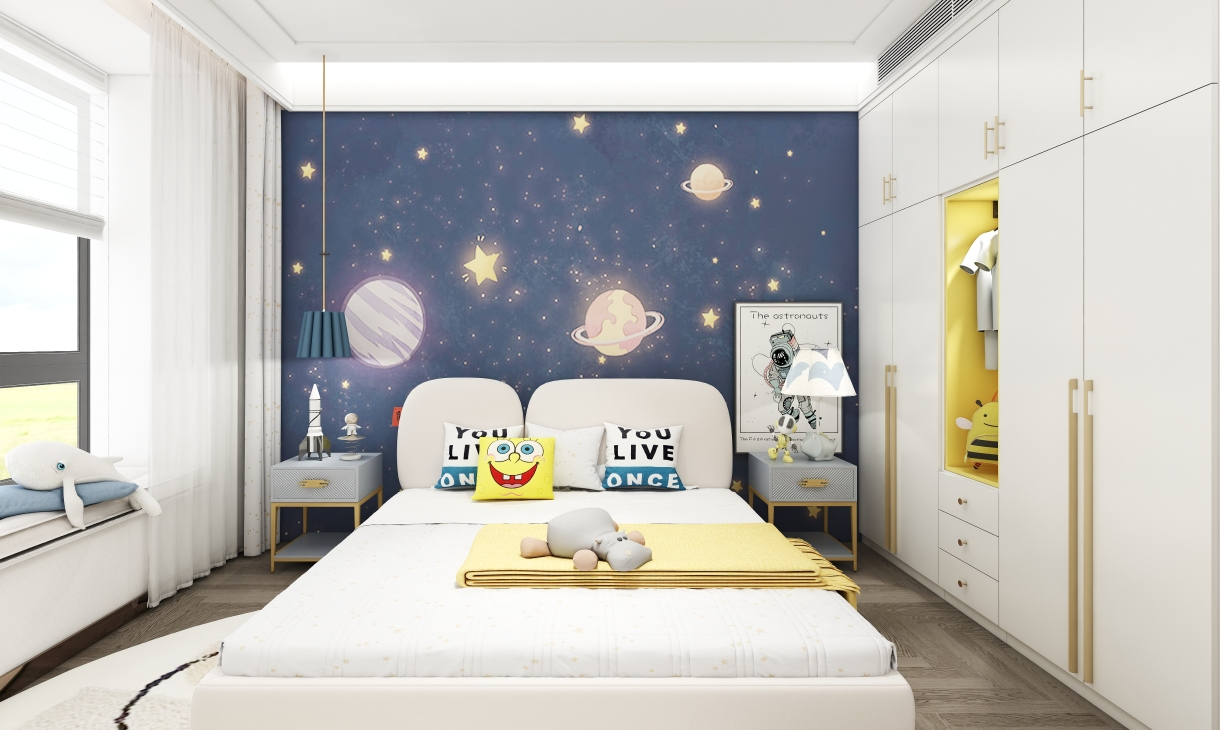 平靜又充滿童趣的兒童房,可愛的裝飾物點綴著淺色的墻面,床柜一體式的設計,顯色空間層次豐盈,整個兒童房柔軟而溫馨。